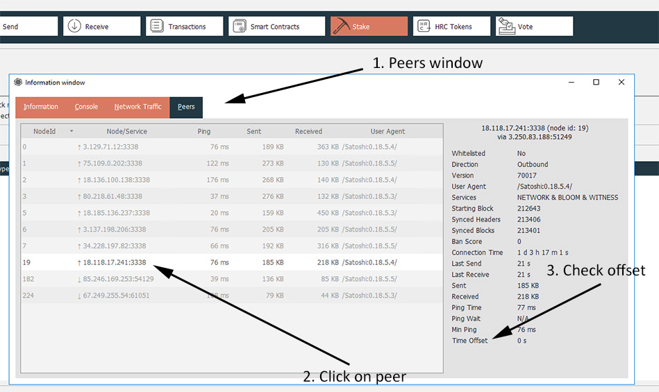 The staking wallet can show the time offsets with other connected peers. Here you find the screen below: HELP > INFORMATION WINDOW > PEERS
