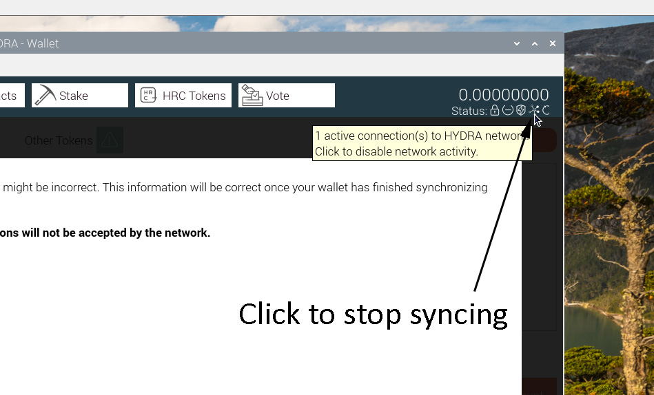 Sometimes you may want to stop syncing the wallet with the blockchain without exiting the wallet. This can be done by clicking the