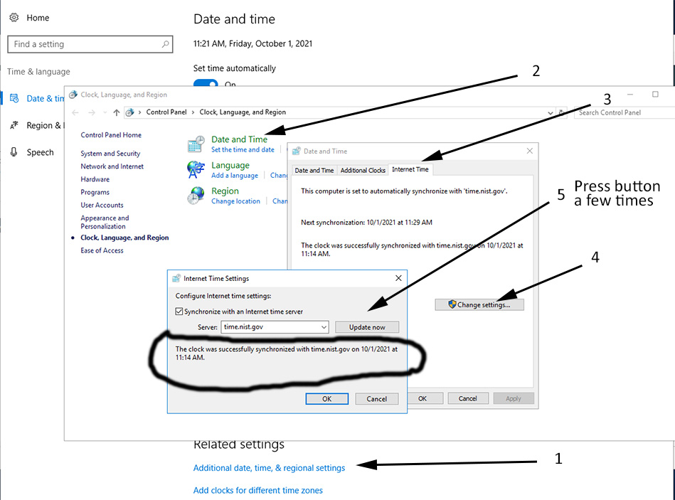 √ Here is an article with detailed step by step instructions for Windows > https://mashtips.com/fix-time-not-updating-syncing-windows10/