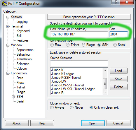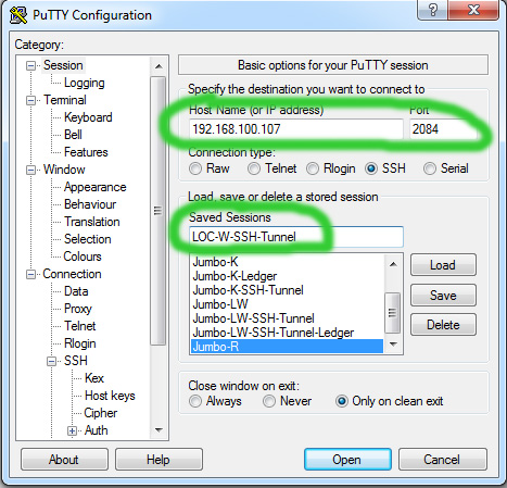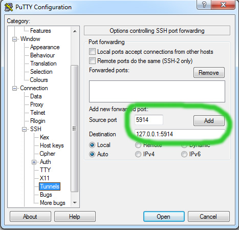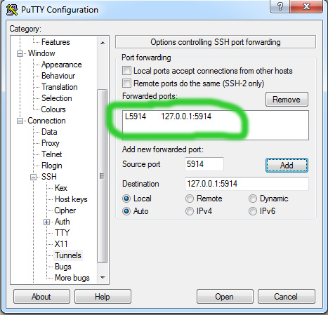 - Next you set up Putty on Windows to establish the tunnel when SSH session is started. You make the follwing settings in Putty: