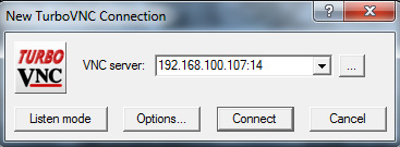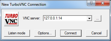 After you start the RealVNC server (type startVNC in SSH session), you use the following settings in the TurboVNC viewer on your remote PC to connect: