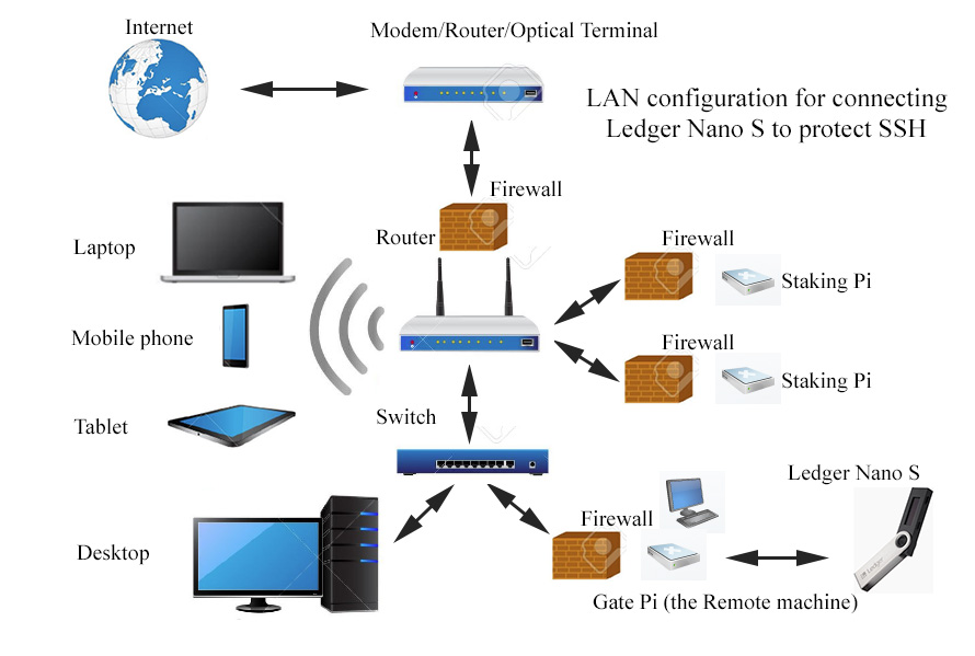 Let's begin with a diagram showing the LAN setup to use the Ledger Nano S. We need an extra Raspberry Pi (a Pi3b+ does an excellent job) to use it as a Gate to the LOC staking Pi. The Gate "pi@Lock" is connected to a monitor and to a keyboard/mouse. When all is set up the staking Pi should have a firewall configured to allow SSH access only from the IP address of the Gate Pi. Note that instead of the extra Raspberry Pi you can use any Linux or Mac machine as the Gate (the Remote machine). Here is the diagram: